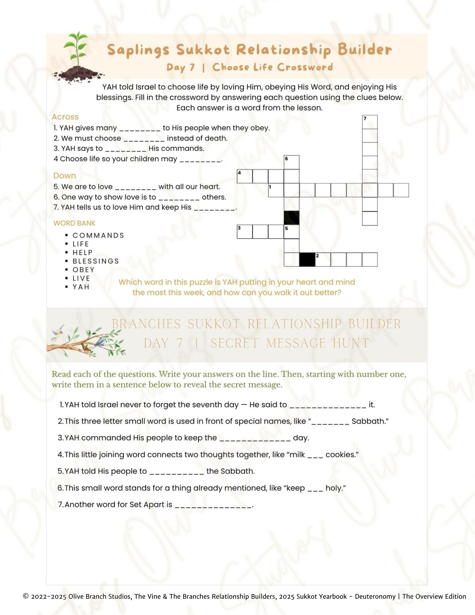 Celebrate the Feast of Tabernacles with a hands-on resource for all ages. The Vine & The Branches Relationship Builders - Sukkot 2025 Yearbook, Deuteronomy | The Overview Edition takes you on an eight-day journey through the book of Deuteronomy during Sukkot. Each day’s devotional, reflection, and family activity draws you closer to YAH as you dwell in His presence and rejoice in His faithfulness. Designed as both a study companion and workbook, this yearbook captures your family’s personal walk through Sukkot — creating a meaningful record of how He met you in this appointed time.