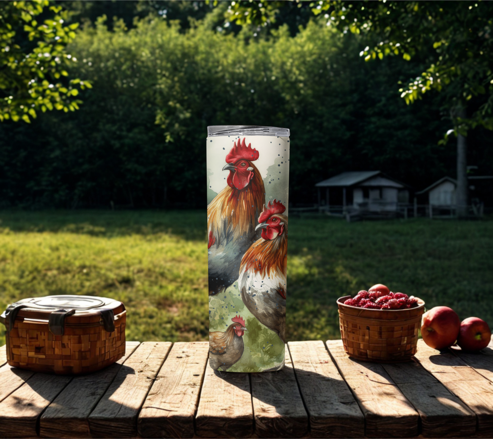 Start your mornings like a true country champ with our Rise & Shine Rooster Tumbler! Featuring a beautifully hand-painted watercolor design of bold roosters and hens, this 20-oz stainless steel tumbler is perfect for farm lovers, early risers, or anyone who enjoys a rustic touch with their daily brew. The vibrant farmhouse artwork wraps around the tumbler, making every sip a stroll through the coop.